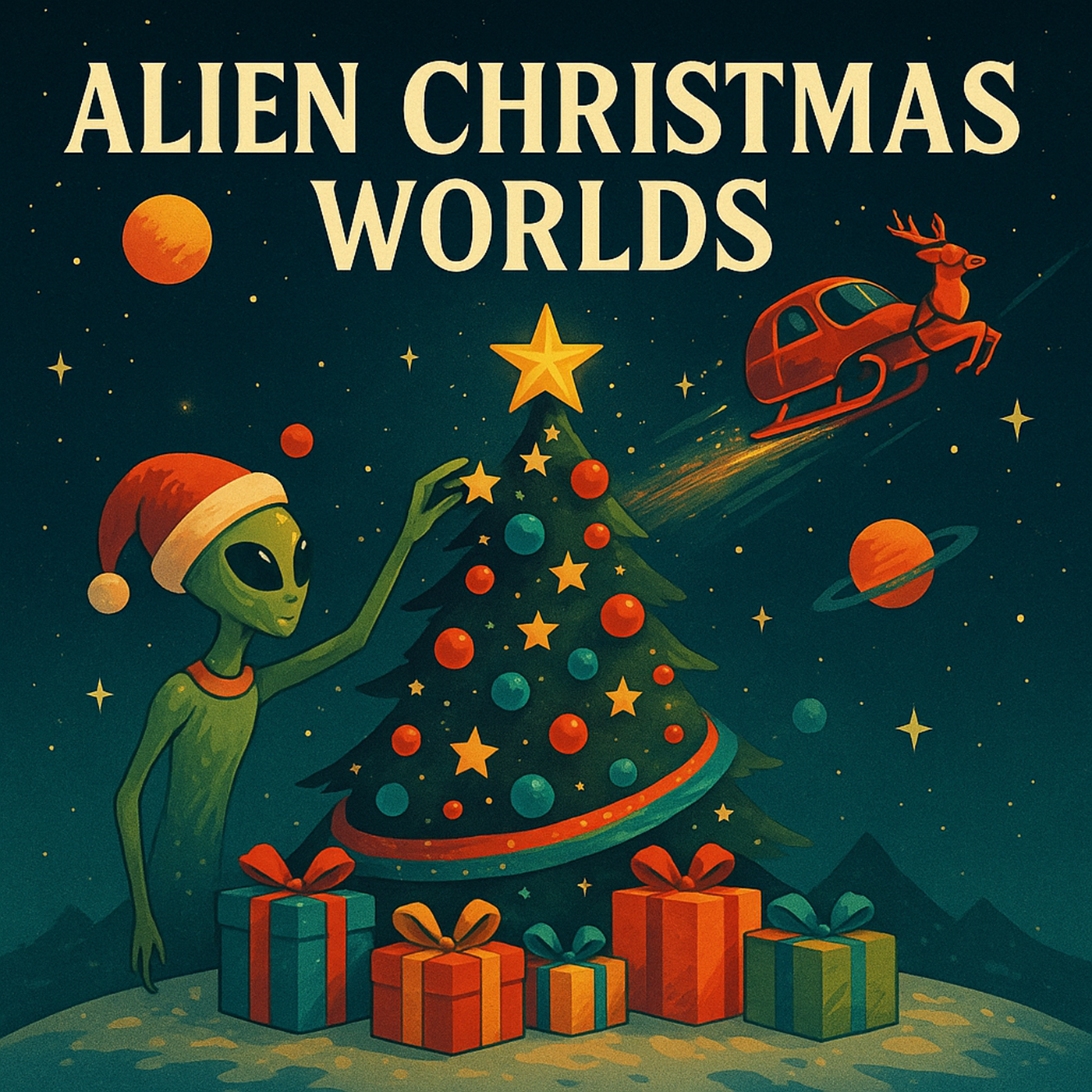 Alien Christmas Worlds is a festive sci-fi story album that blasts holiday cheer across the cosmos. Each track lands on a different planet to explore how strange civilizations celebrate Christmas—tree-shaped nebulae glowing with starlight, snow drifting in zero gravity, robotic choirs beeping out carols, cookies that literally crawl away, and Santa navigating everything from alien languages to lava-planet chimneys.